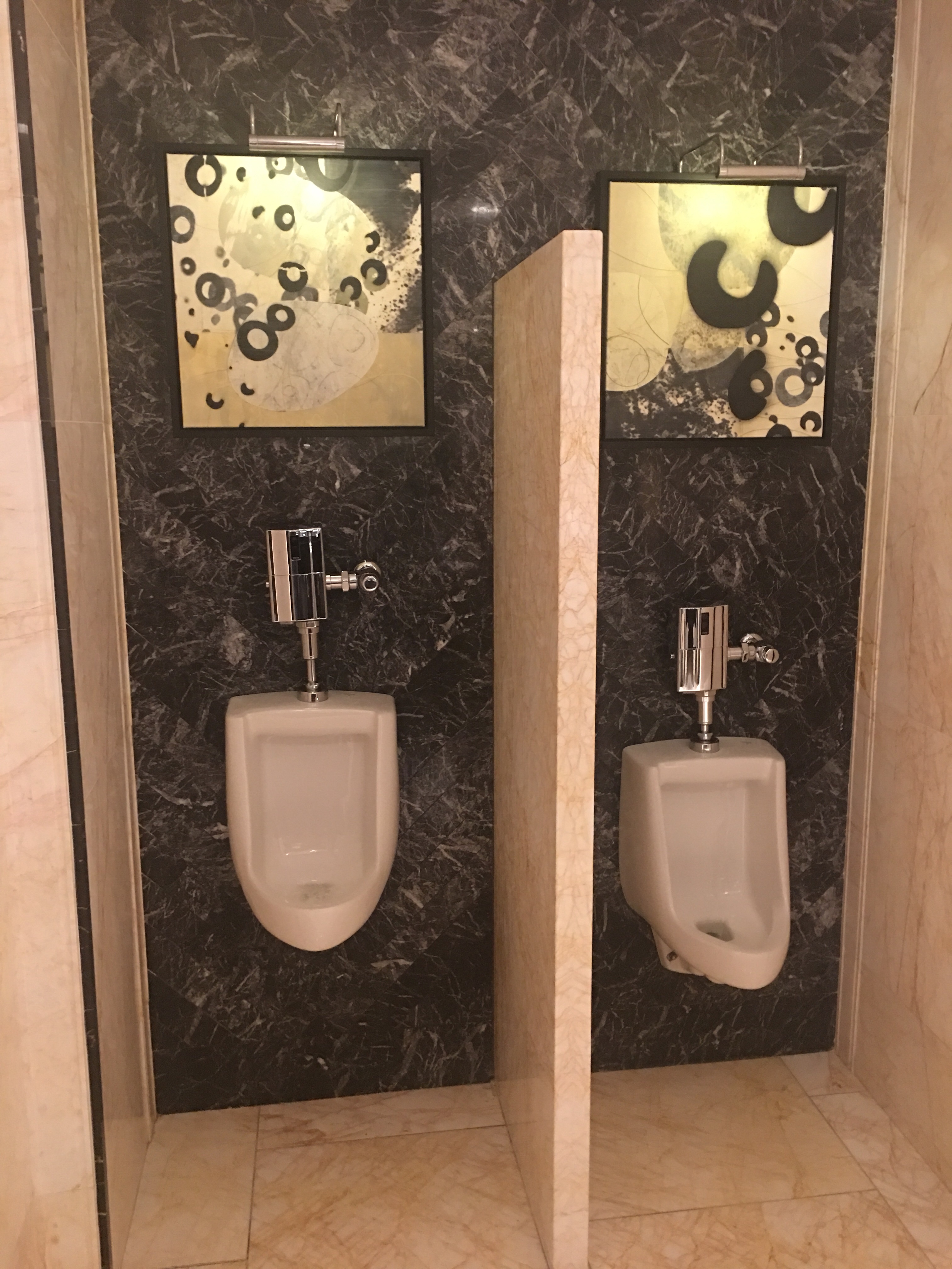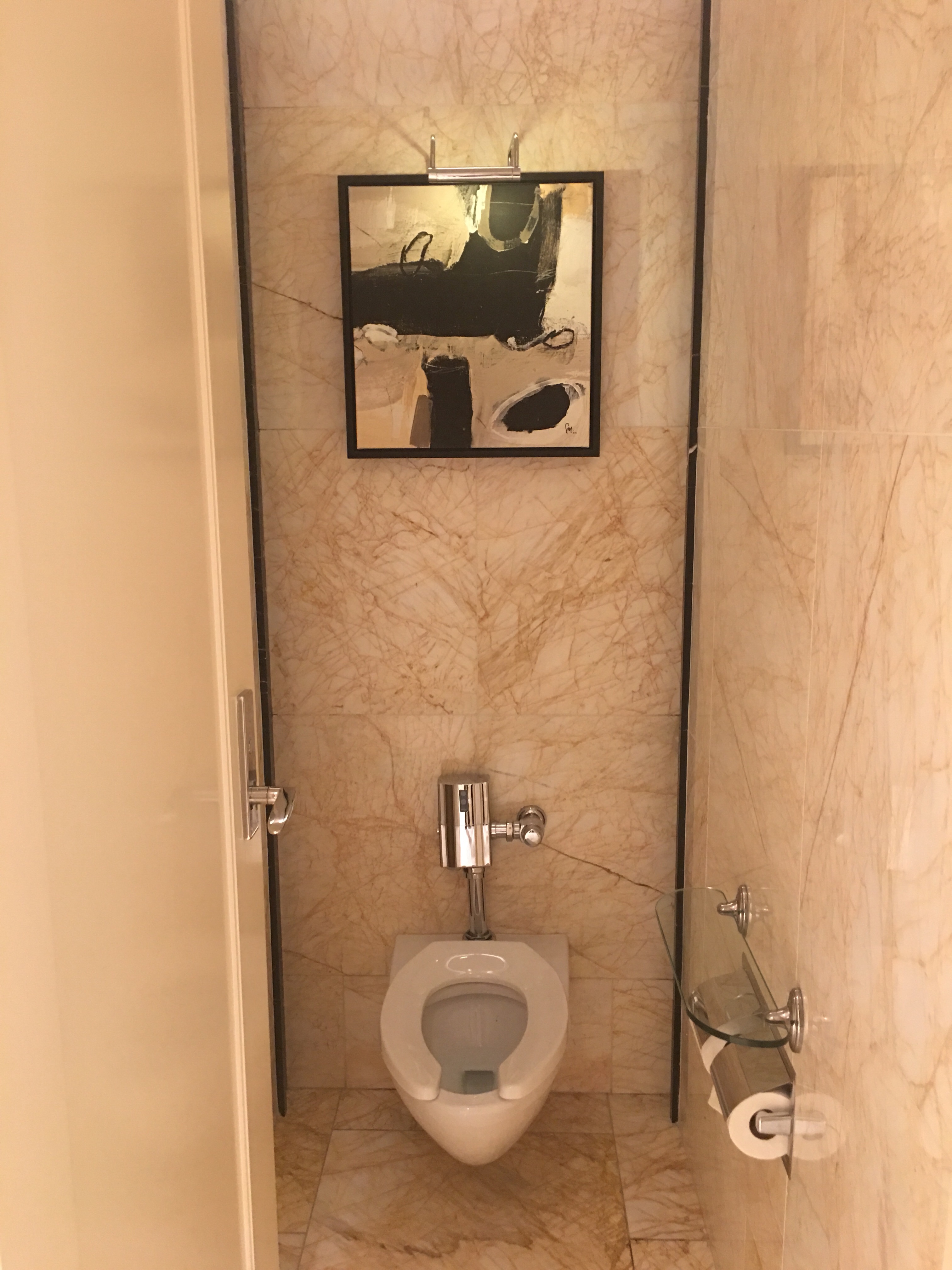 The artwork and lighting really highlight the marlble, and the stall has a floor to ceiling door plus a nice glass shelf for your phone or whatever else you have.